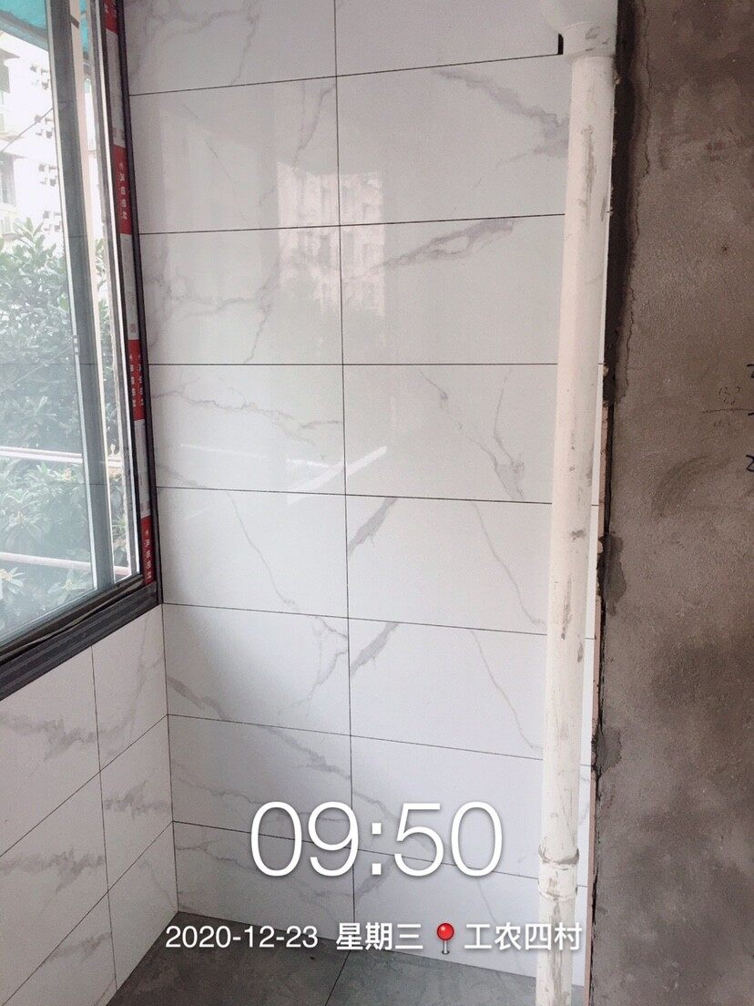 贴砖可是件手艺活。平整度,花色的拼接都显示出了师傅的手艺。