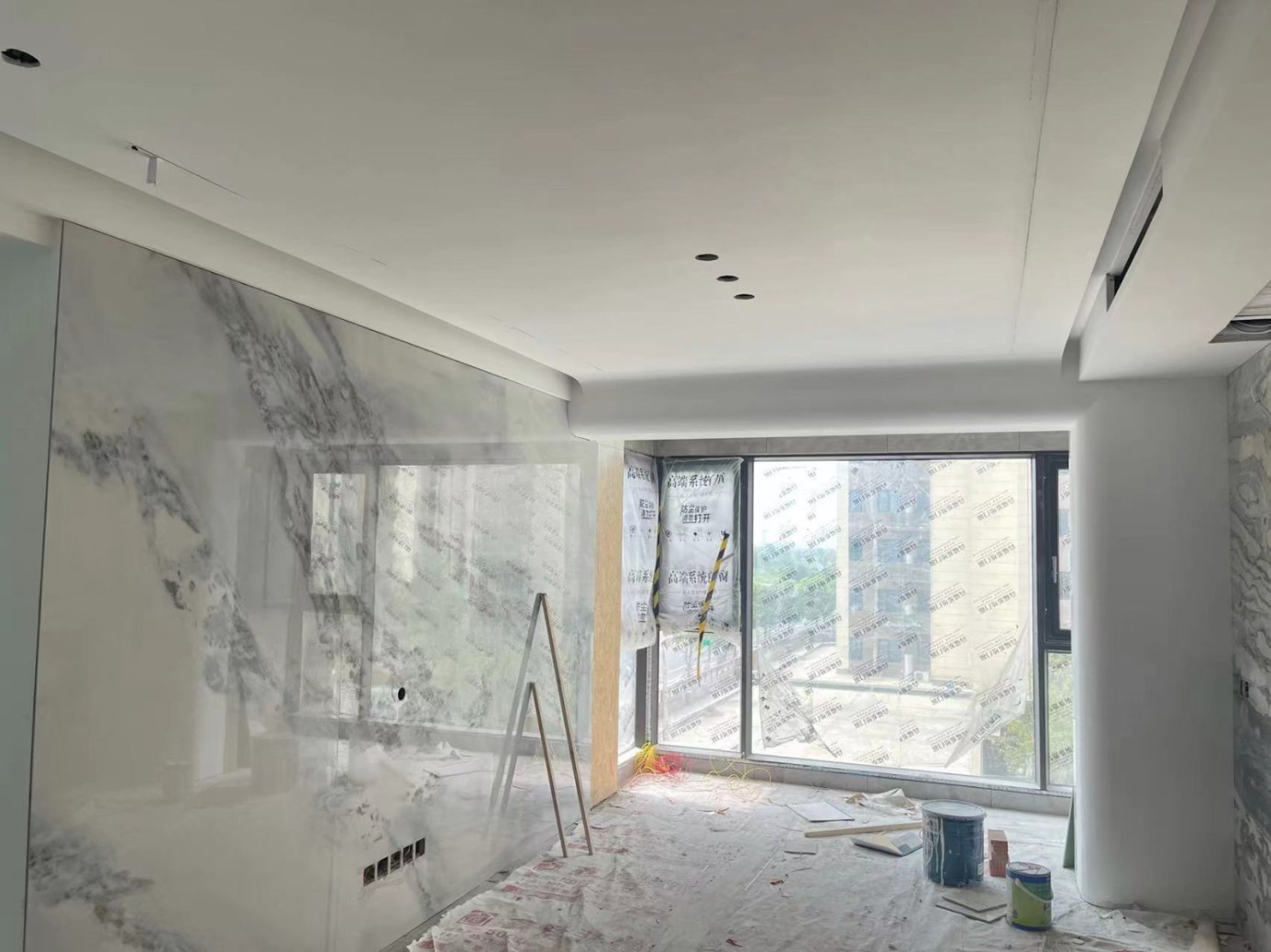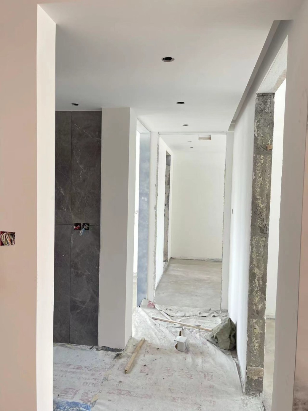 油漆阶段 1.铲除原白灰墙面铲除毛坯房原来的白灰墙 2.墙面界面剂使用零污染丙烯酸蓝钻界面剂处理 3.结构石膏粗找平保证墙面平整,不易开裂发潮 4.第一次腻子精细找平使墙面不至于发潮、开裂、掉粉,第二次腻子精细找平使墙面更加平整封闭性更好墙面砂纸打磨保证墙面平整整洁,方便后期上乳胶漆 5.抗碱底漆增加漆面丰满度,提高抗碱性,增强防腐功能等 6.第一层面漆,第二层面漆进行双重防护加固墙面