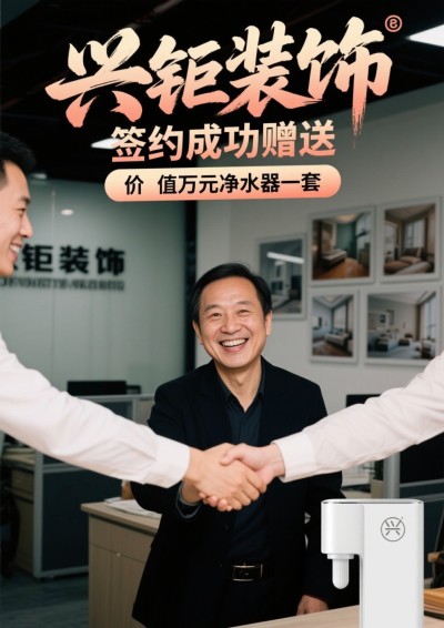 装修焕新家,豪礼重磅来袭!兴钜装饰诚意巨献,即日起,凡签订装修合同金额达10万元及以上,即赠价值万元高端净水器一套,为您和家人的健康饮水保驾护航!让清新水质融入日常,畅享品质生活。特别说明:参与打折优惠活动的订单不与本赠品同享,优惠不叠加。机会难得,品质家装与健康好物一步到位,速来锁定名额,开启理想...