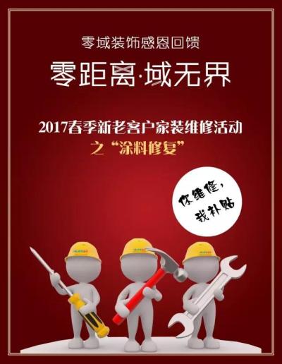2017春季家装维修活动开始报名啦!此次活动,无论您是否是零域装饰的客户都能获得我们快捷、标准、实惠的维修服务!报名方式:电话:400-100-3379也可通过我们微信平台留言维修区域:松江老城区、新城区报名时间:即日起至2017.4.10日报名名额:零域老客户:20名非零域客户:20名补贴金额:零