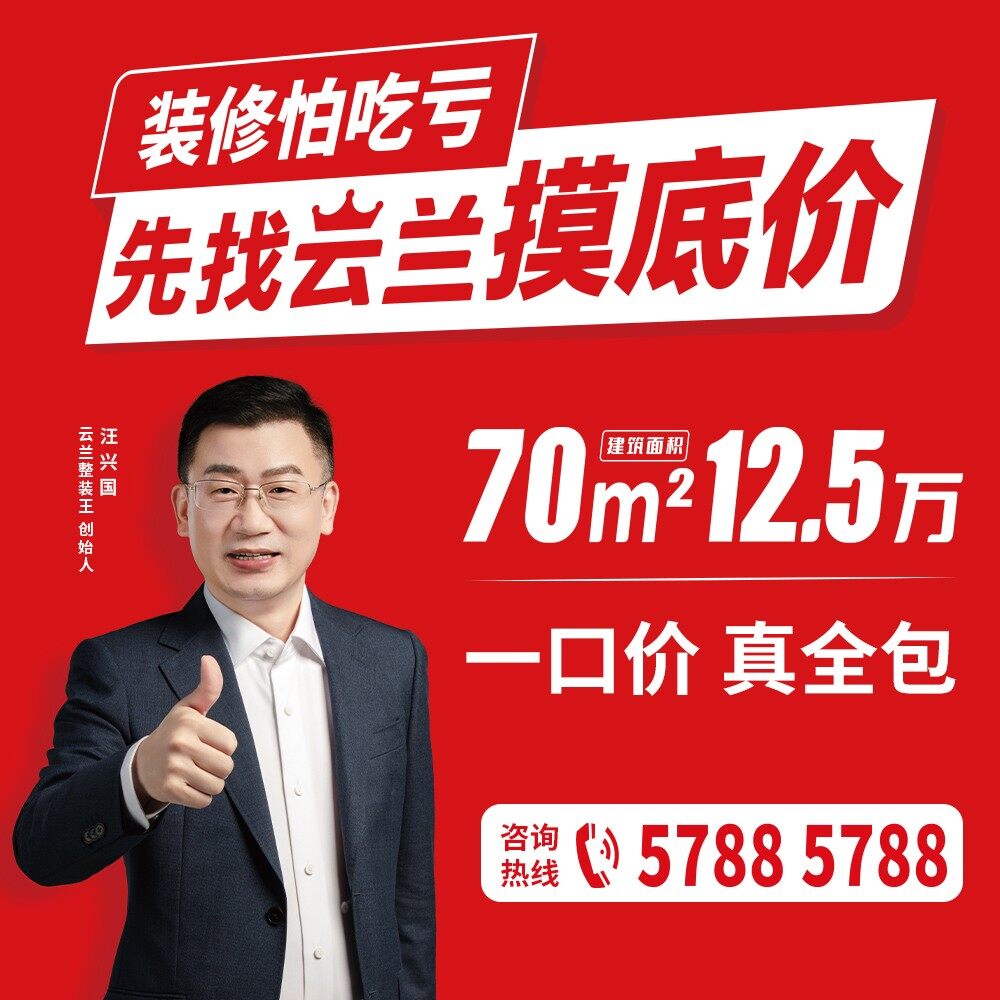 装修怕吃亏,先找云兰摸底价!找云兰,摸价格:怕套餐装修糊涂账乱加钱?云兰整装王清单式整装价格大全上墙公示,开工后不增项不加钱;找云兰,摸质量:怕施工质量扯皮无标准?云兰整装王6642金钻工地欧标体系,质量无忧不扯皮;找云兰,摸材料:怕材料假冒伪劣不环保?今天完工,明天保洁,最快后台就可入住,超2万平实景展厅5000多种材料亮证保真,真环保才健康;找云兰,摸服务:怕出现问题没人来解决?装修有问题,一键向汪总直达号开炮。