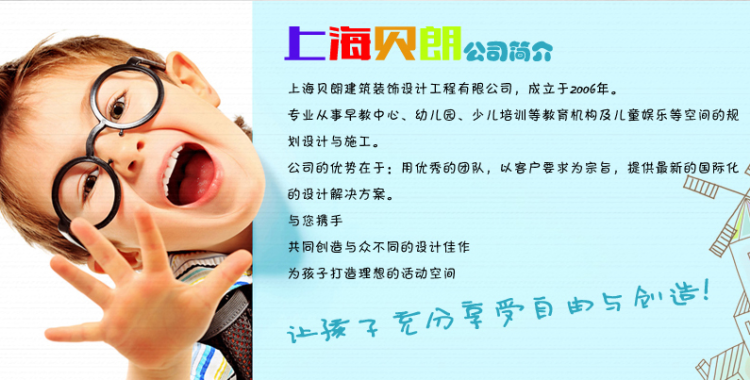 上海贝朗建筑装饰工程有限公司,成立于2006年。专业从事早教中心、幼儿园、少儿培训等教育机构及儿童娱乐等空间的规划设计与施工。公司的优势在于:用优秀的团队,一客户求宗旨,提供最新的国际化的设计解决方案。与您携手共同创造与众不同的世界佳作为孩子打造理想的活动空间...