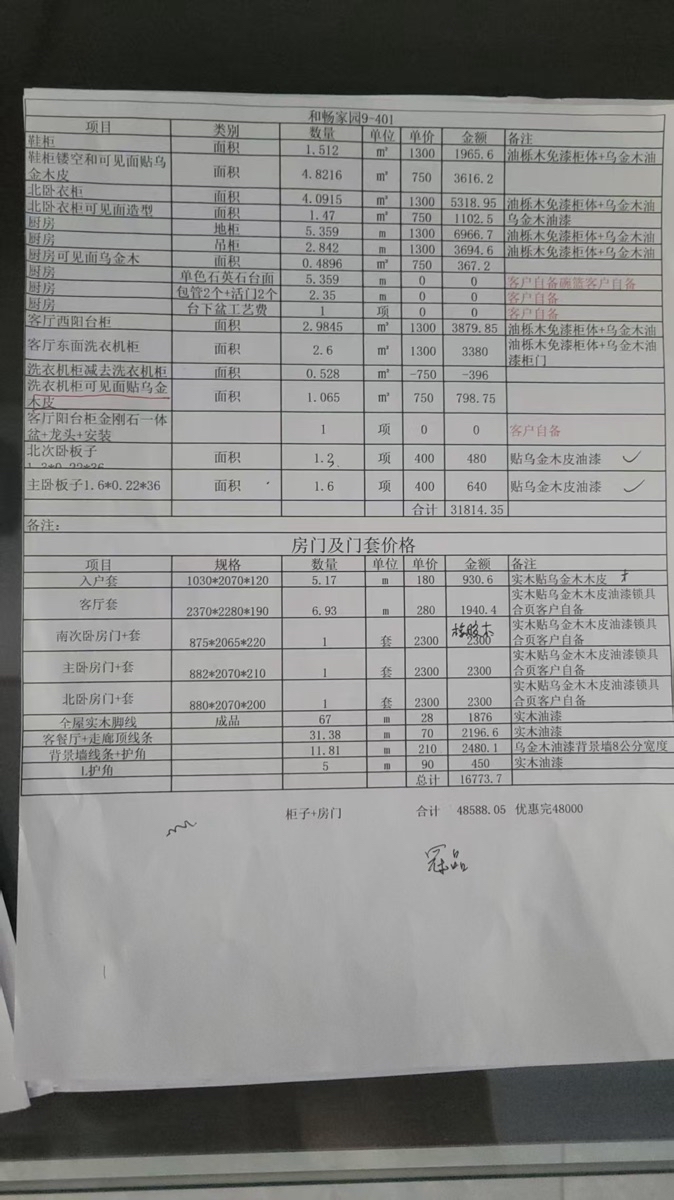 为了牟利不按项目报价单材料定制偷换材料导致房门与柜门色差纹理等色差很大。吊顶L线条色差更大,柜门可见面正面侧面漆色差大不协调,喷漆偷工减料。导致装修停止无法进行。要求退款赔偿损失没有诚信做工粗糙无法让客户信任。